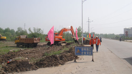 我公司承建的阜南县世纪大道道路及排水一标段工程,已完成了工程总施工进度计划、施工组织设计、施工测量及料场和设备进场等工作,经监理审批,于5月1日开工。 工程概况: 从南五岔路口~淮河东路路口,道路全长约2760米,道路红线60米,其中机动车道31米(双向八车道),绿化分隔带3米×2,非机动车道6.5米×2,人行道5米×2,绿化带10米×2,路面为沥青混凝土。 本次施工完成道路(机动车道、非机动车道和人行道)、雨水及污水管道的施工。 老路部分机动车道路面结构:4cmSBS改性沥青AC-13+粘层+8cmmAC-25+下封层、透层+30cm氺稳+钢塑格栅+打裂压稳处理的旧混凝土路面;拓宽部分机动车道路面结构:4cmSBS改性沥青AC-13+粘层+8cmmAC-25+下封层、透层+30cm氺稳+钢塑格栅+24cm级配碎石+20cm12%石灰土;非机动车道:3cmAC-10+粘层+5cmAC-20+下封层+20cm氺稳+20cm10%石灰土;人行道结构:6cm预制纽西兰地砖+2.5cm1:4水泥砂浆+10cm氺稳+15cm10%石灰土。 在新建雨水管线,采用DN300、DN600、DN800、DN1000、DN1200、DN2000管径钢筋混凝土平口管。 在新建污水管线,采用DN500、DN600、DN700、DN800、DN1200管径钢筋混凝土承插管。