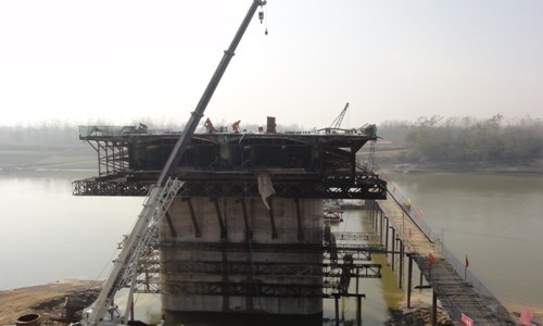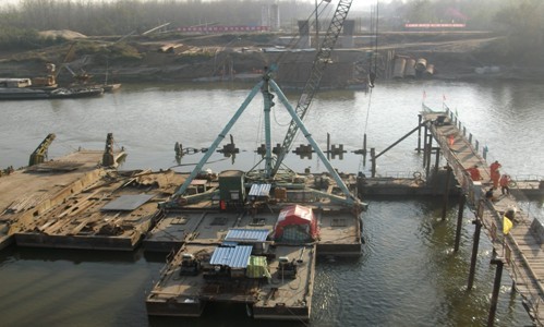 2、桥梁工程:北岸浇筑2-3#跨现浇箱梁底层,水中浇筑4#墩悬浇箱梁0-1#块