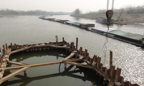 5#墩钢板桩围堰,项目部已在桥位上下游500米处埋设安全警示标志