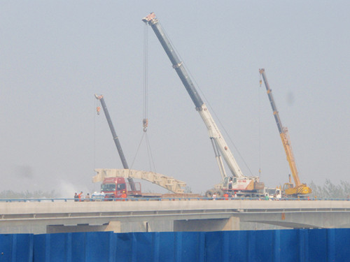 10月14日上午,伴随着响亮悠长的鞭炮声,茨淮新河大桥项目部积极组织、合理安排,在现场管理人员和作业人员的共同努力下,老桥首片桁架拱片被顺利拆除。