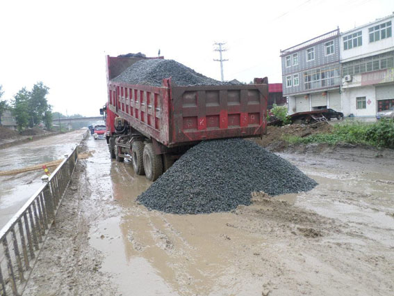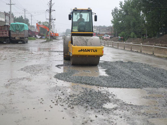 这次演练主要是针对局部暴雨可能造成的水毁道路现象,从而展开紧急修复,保障畅通的一场防汛抢险演练。在防汛领导小组一声令下,演习现场的应急抢险保通队员迅速跑步进入“抢修”路段、分成多个抢险小组参加应急抢险。具体演练内容有:安全员李朋负责设置安全警示牌,提醒过往车辆注意安全,谨慎缓慢通行,禁止无关人员靠近事故现场,避免施工机械伤及他人;挖掘机挖设排水沟及临时蓄水池,将路面积水排至临时蓄水池内;张浩萌将级配碎石运至现场;随后采用装载机分料找平路面坑槽;利用压路机将级配碎石碾压压实后开放交通。