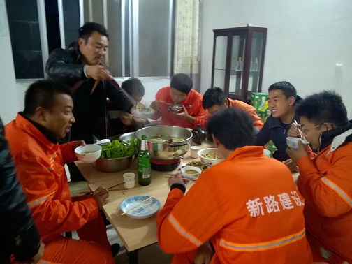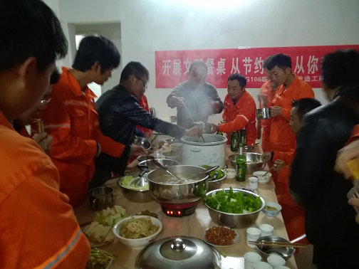 11月5日,连日来的阴天终于转为雨点落了下来,伴随着大风,天气异常寒冷。在这样的天气下现场施工已经无法展开,我部决定于当天晚上给大家加油鼓劲创造温暖,特举办会餐活动,煮上两大锅热腾腾的火锅,驱除寒冷的同时联系感情。寒冷的冬夜能吃上热腾腾的火锅实在是一种难得的享受,大家各自下菜,互相帮忙夹菜,气氛很是温暖融洽。通过大家开心的笑脸就知道这次活动举办的值得,举办的成功。