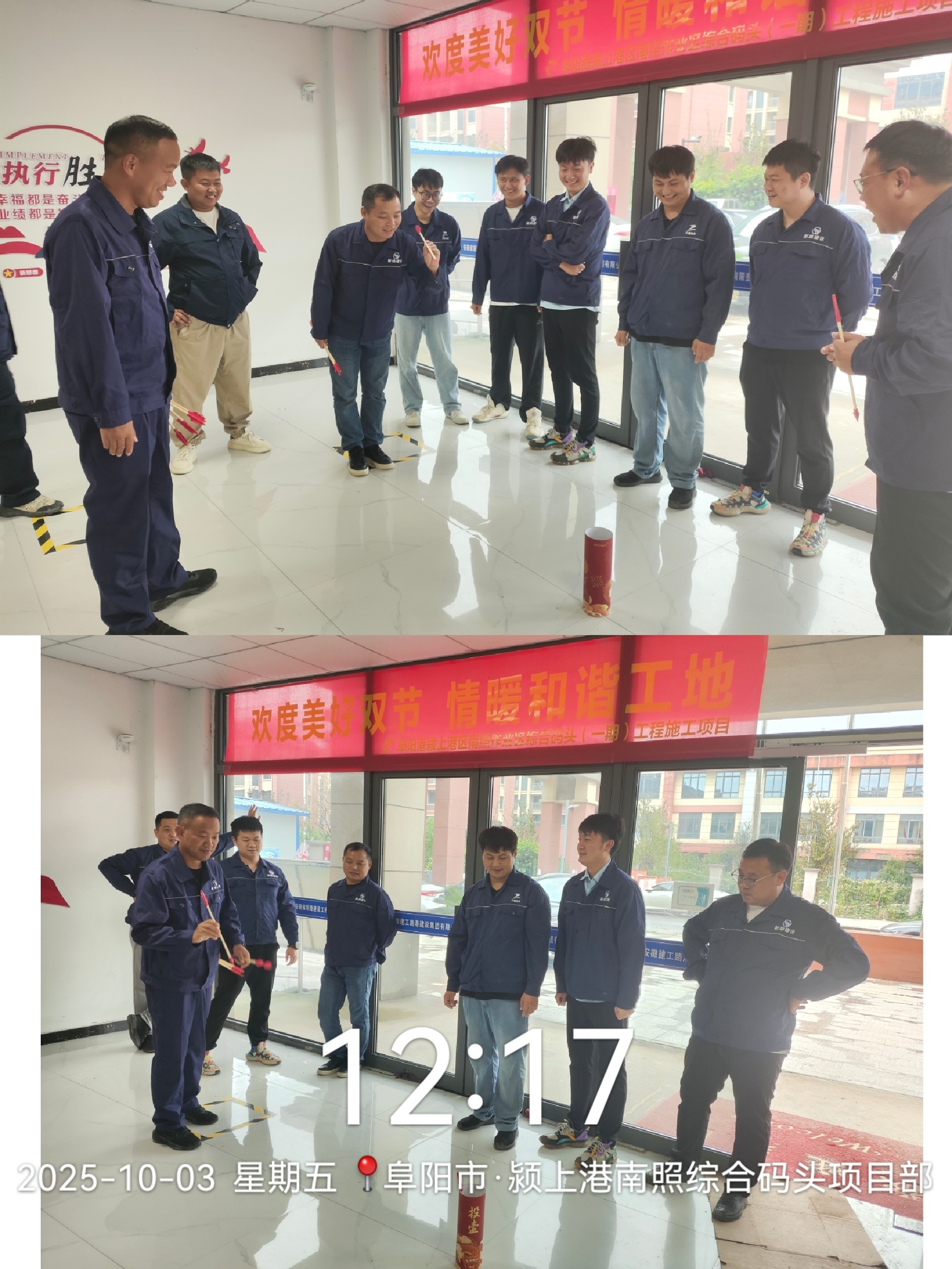 10月3日中午,颍上港南照综合码头项目举办“欢度美好双节 情暖和谐工地”中秋佳节活动,传统雅致的“投壶射礼”、气氛热烈的“蒙眼原地踏步”、寓意吉祥的“一滚好运来”等游戏精彩纷呈、趣味横生,让现场充满了欢声笑语、阵阵掌声。员工们踊跃参与,在轻松愉快的氛围中放松了身心,增进了情谊。活动最后,获胜员工手捧奖品,脸上洋溢着幸福和满足的笑容,大家共同合影留念,为此次活动画上了圆满的句号。