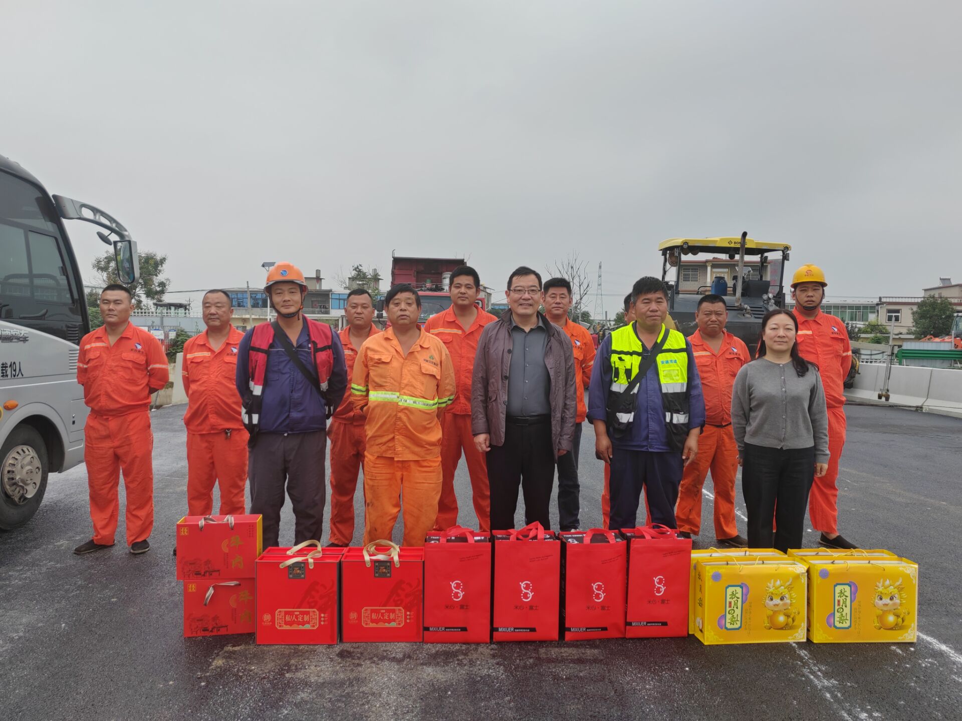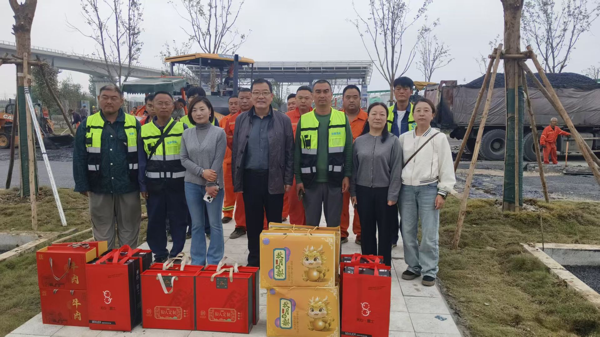 2025年9月28日,中秋佳节来临之际,安徽茂诚路桥工程有限公司总经理田明坤带队深入各班组一线,开展“情暖中秋·关爱同行”主题慰问活动,为坚守岗位的员工送去节日的问候与关怀。将公司精心准备的月饼、生活用品等慰问品送到员工手中,让奋战在施工一线的建设者们感受到浓浓的节日氛围和企业的温暖。